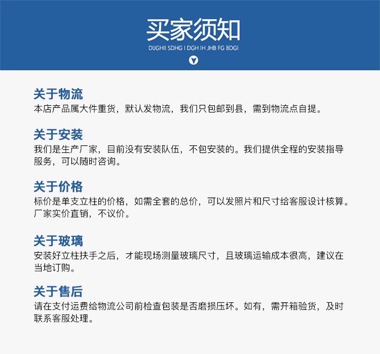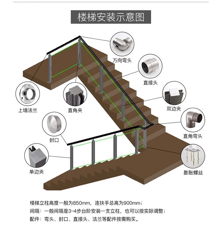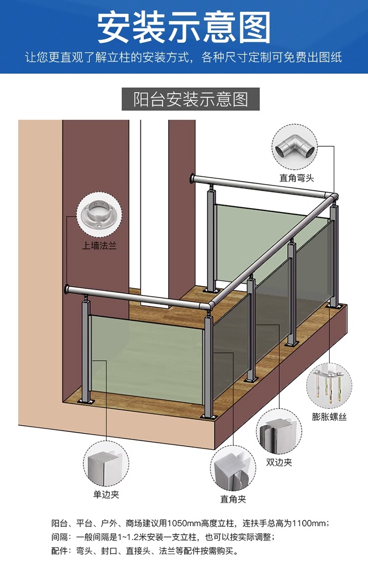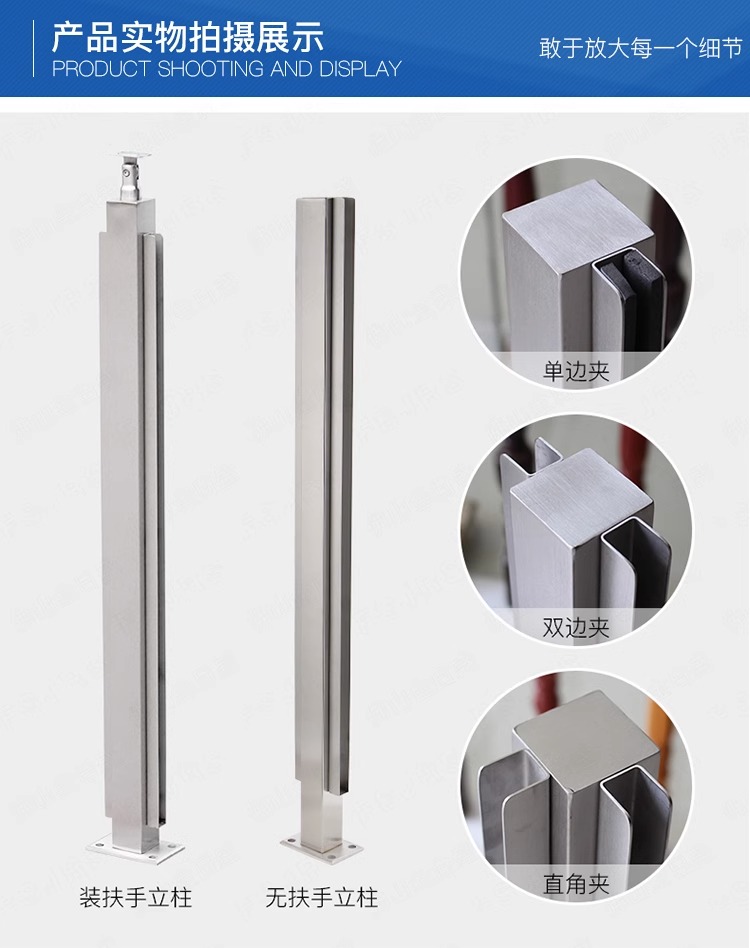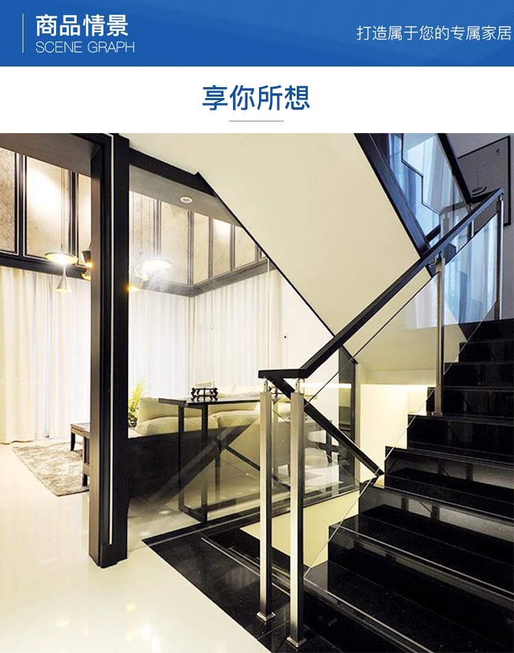 产品采用国标304不锈钢材质,玻璃安装采用免打孔方式,降低了安装损失风险,保证质量和成本的同时也能使得外观高端大气。适用场景: 家用/商场/户外平台/河道围栏