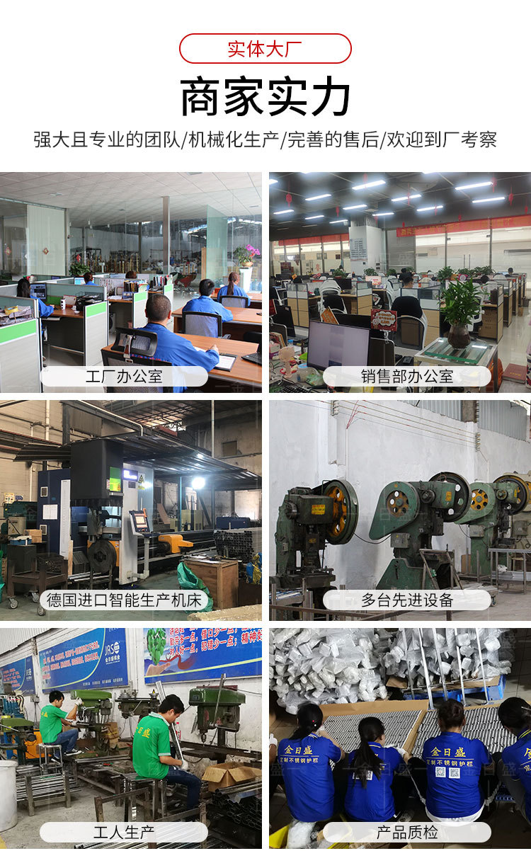 公司设立:裁切车间,焊接车间,零配件生产车间,组装车间,为建筑工程商,提供一站式 不锈钢护栏以及不锈钢配件供应